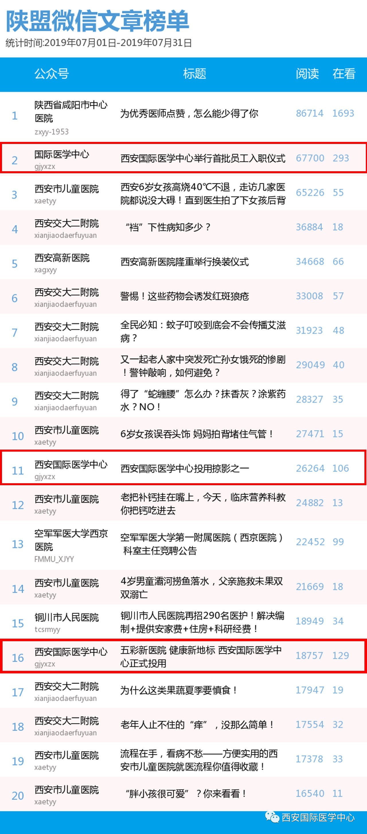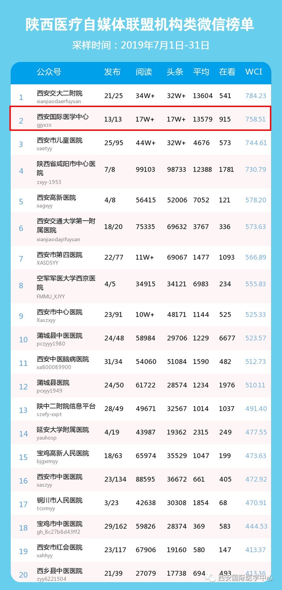 8月2日,中國醫(yī)療自媒體聯(lián)盟陜西分盟醫(yī)療機構(gòu)類微信公眾號7月份排行榜發(fā)布,西安國際醫(yī)學中心微信公眾號奪得醫(yī)療機構(gòu)類榜單第2名,高居“榜眼”。在陜西醫(yī)療自媒體聯(lián)盟的推薦下,西安國際醫(yī)學中心順利進入今日頭條號(醫(yī)療機構(gòu)),微信文章將同步刊登到今日頭條。