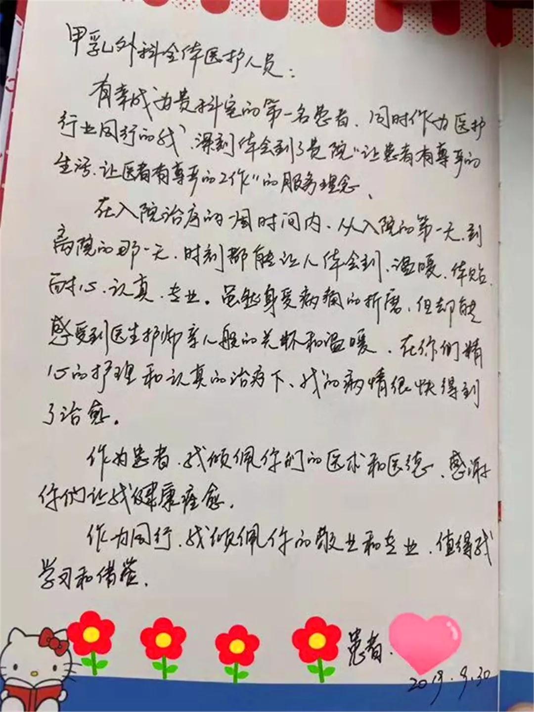 10月1日下午,甲乳外科第一位患者康復(fù)出院了!甲乳外科劉曉敏主任及科室醫(yī)護(hù)人員在患者住院期間,依靠專(zhuān)業(yè)的治療及精心的護(hù)理,讓患者感受到了親人般的關(guān)懷和溫暖,病人很快得到康復(fù)出院。