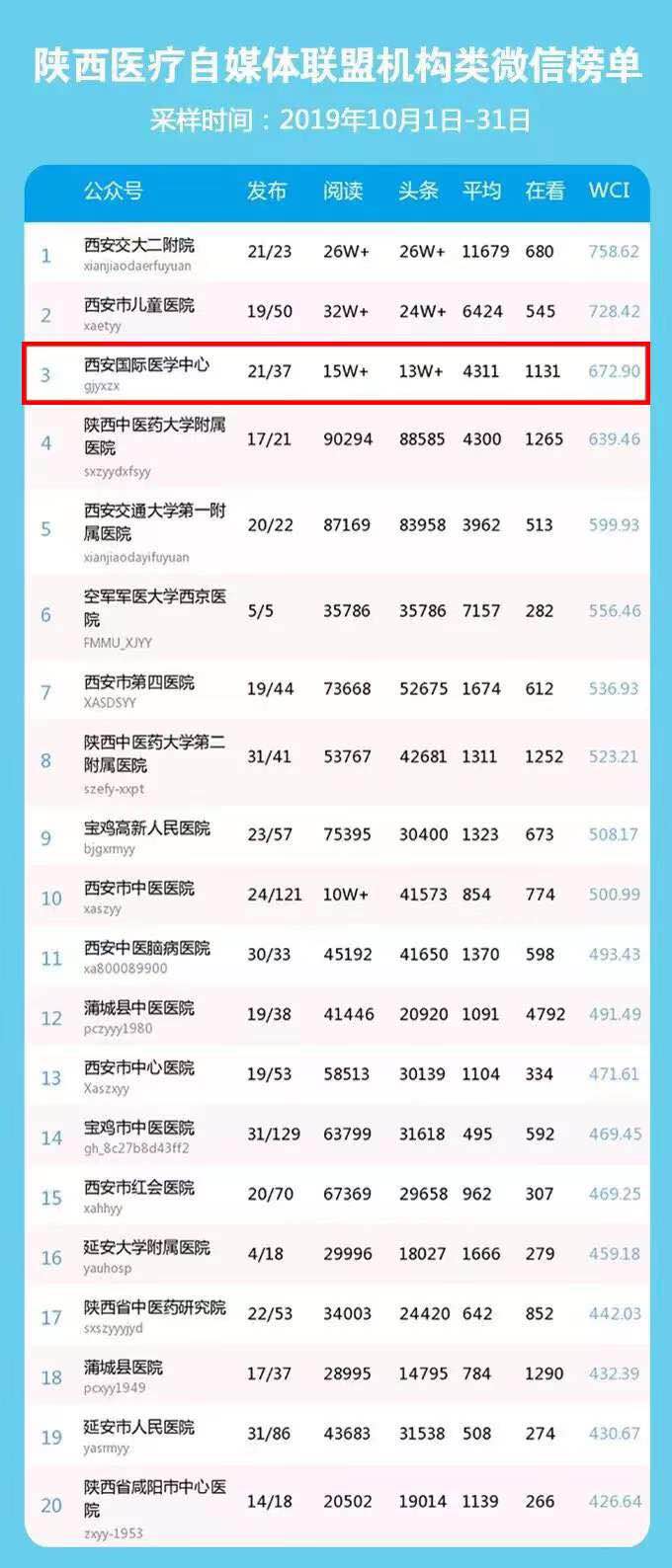 10月榜單數(shù)據(jù):西安國際醫(yī)學中心微信公眾號總閱讀數(shù)15w 、頭條閱讀數(shù)13w 、平均閱讀數(shù)4311、總在看數(shù)1131、微信傳播指數(shù)WCI672.9。