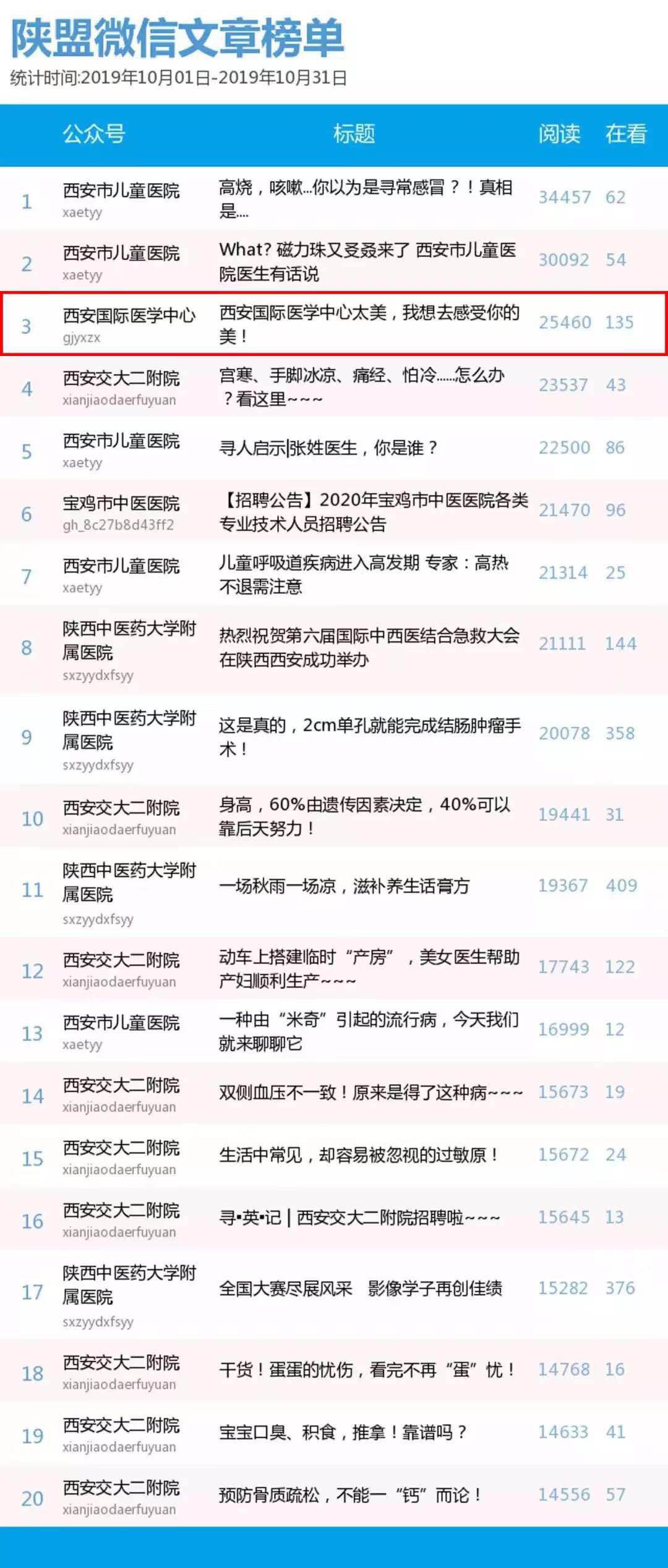 陜西醫(yī)療自媒體聯(lián)盟醫(yī)療機構類微信公眾號2019年10月微信文章榜單第三名——《西安國際醫(yī)學中心太美,我想去感受你的美》。文章從醫(yī)院優(yōu)美的環(huán)境角度切入,詳細介紹了西安國際醫(yī)學中心的地理位置、建筑特色、就醫(yī)環(huán)境、名醫(yī)專家、醫(yī)療惠民等,最終獲得25460的閱讀量,位列第三。
