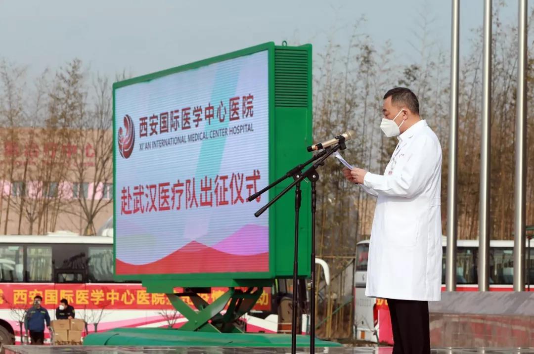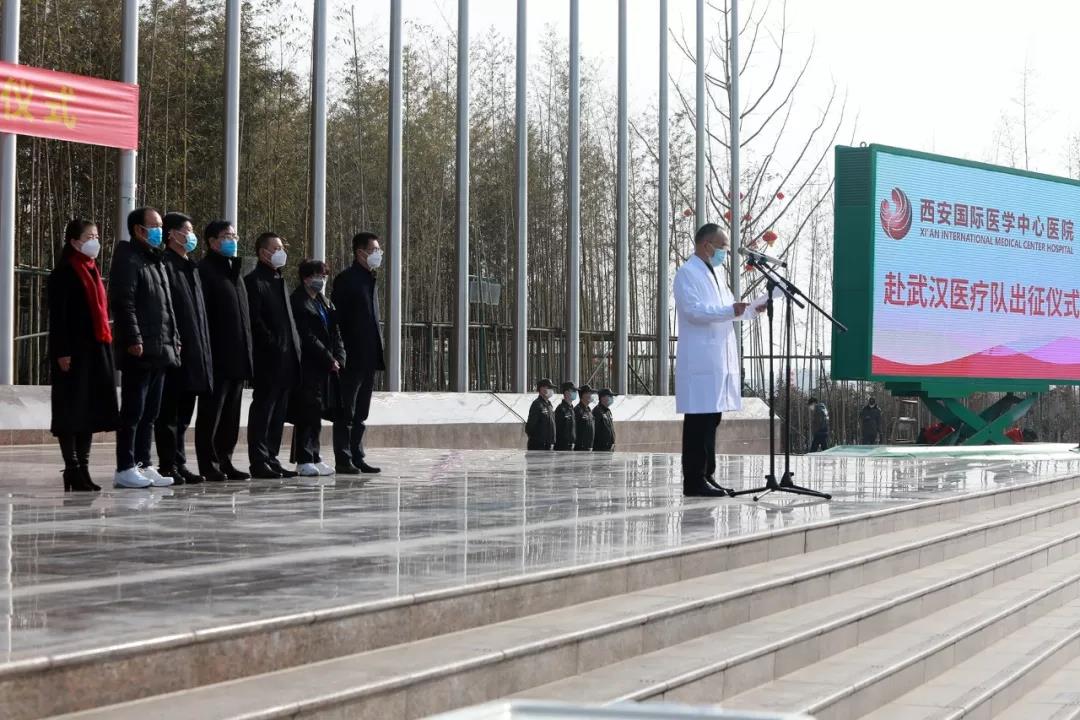 上午10時(shí)30分,出征儀式在西安國(guó)際醫(yī)學(xué)中心醫(yī)院萬(wàn)人廣場(chǎng)舉行。尹強(qiáng)院長(zhǎng)講話(huà),并向醫(yī)療隊(duì)授旗。他說(shuō),平時(shí)我們是醫(yī)務(wù)人員,但在關(guān)鍵時(shí)刻,在疫情面前,我們就是白衣戰(zhàn)士。醫(yī)療隊(duì)隊(duì)長(zhǎng)楊峰副院長(zhǎng)表態(tài),當(dāng)人民安全在危難之際,我們責(zé)無(wú)旁貸。作為國(guó)際醫(yī)學(xué)人,我們將不辱使命,迎難而上,作出應(yīng)有貢獻(xiàn)。