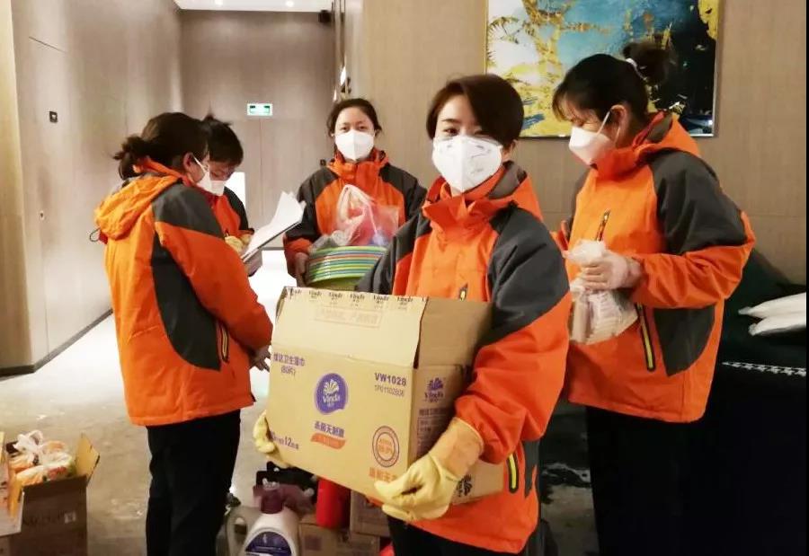 為避免人員頻繁出入,降低交叉感染風(fēng)險(xiǎn),每個樓層固定兩名工作人員,負(fù)責(zé)全樓層30多人一日三餐的收發(fā),幾十個房間的垃圾清運(yùn)處理,樓層公共區(qū)域消毒,各類生活物資清點(diǎn)搬運(yùn)分發(fā),工作量非常大!但是這些姑娘沒有人叫苦叫累,都自稱女漢子,互相加油打氣!
