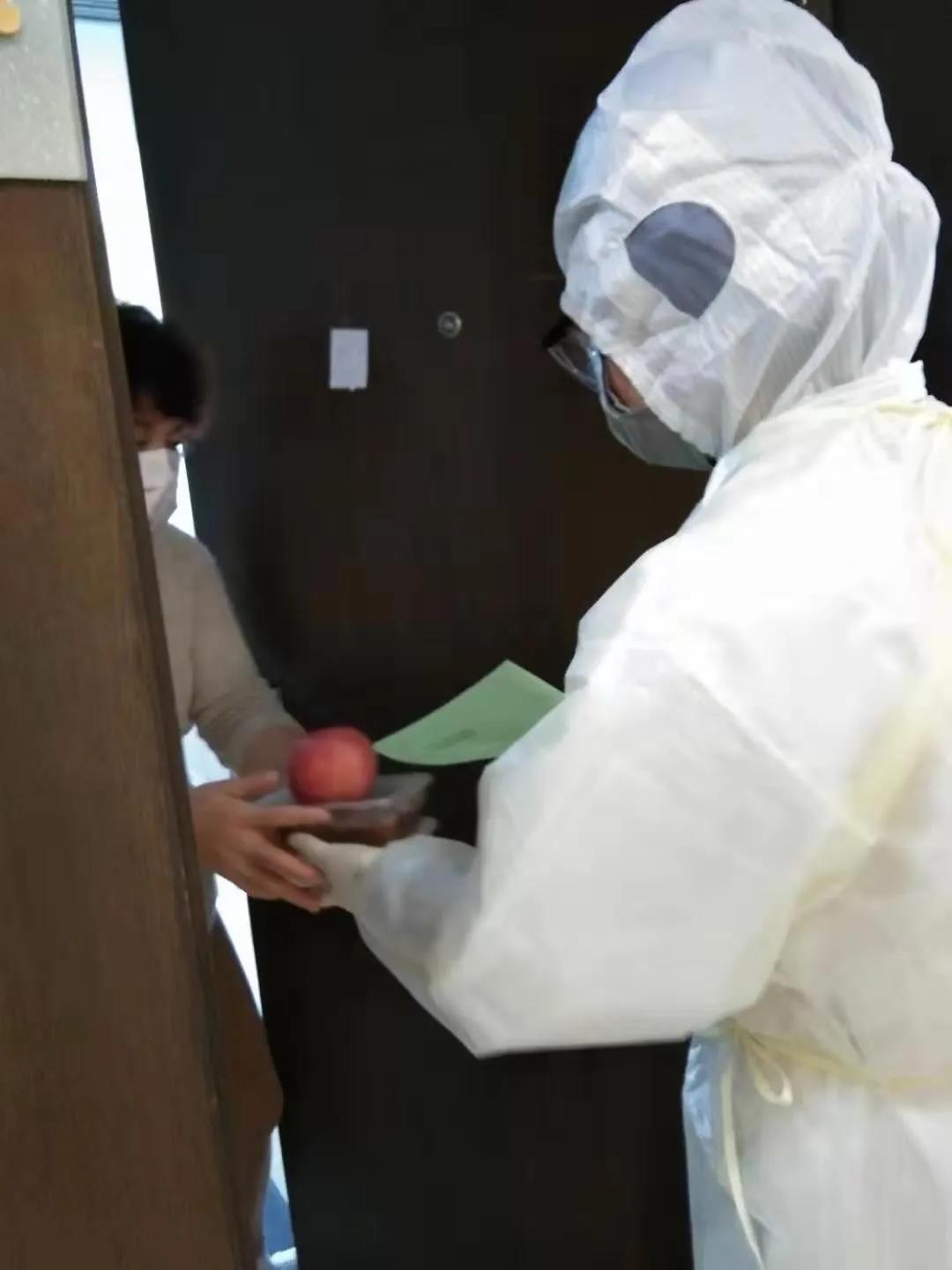 在這里的每一天,“累”是所有醫(yī)務(wù)工作者的共同感受,因?yàn)楦綦x點(diǎn)接受的大都是從武漢回來(lái)的人群,所以我們都要做好三級(jí)防護(hù)的自我保護(hù)措施。這里被隔離者都是我們的親人,生活起居,心理輔導(dǎo),事無(wú)巨細(xì)都由我們照料。記得剛來(lái)的那幾天,穿著不透氣的隔離衣給留觀者送餐時(shí),送到一半時(shí)突然感覺(jué)自己呼吸不暢,后面的衣服都濕透了,怕自己撐不住,趕快跑到安全通道脫下面罩,解開(kāi)隔離衣,那一刻好想休息片刻,但是看著箱子里的飯菜,我又重新穿起了隔離衣。我的放松會(huì)讓飯菜變涼,家人們吃了會(huì)不舒服。想到這里,我邁出堅(jiān)定的步伐,加入到戰(zhàn)斗中。