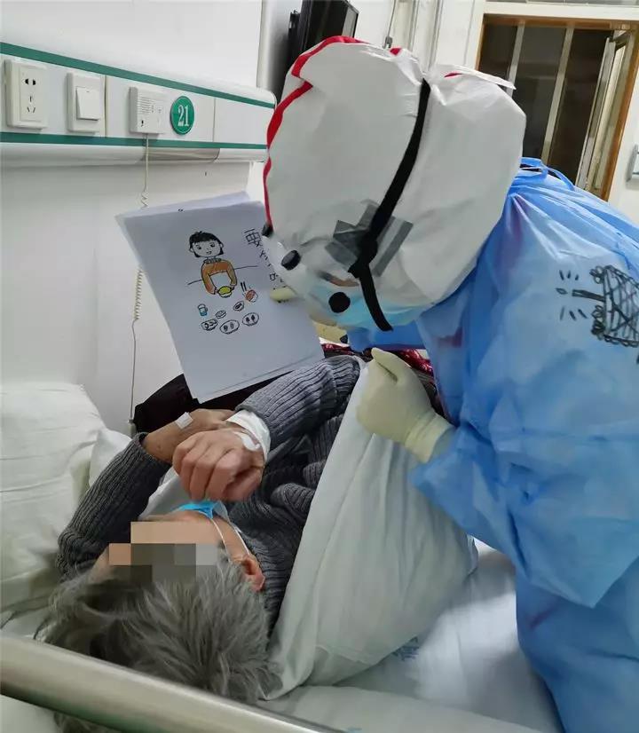 車敏鑫并沒有放棄,依然耐心的用肢體動作比劃著、交流著,大致了解奶奶的意思,并給奶奶找來水杯、臉盆等生活用品。夜間奶奶體溫突然升高到38.3℃,車敏鑫邊比劃著給老奶奶喂水,比劃著叮囑老人發(fā)燒期間要多喝水,和老人一同入院的患者告訴車敏鑫這位奶奶從下午到現(xiàn)在一直沒吃飯,醫(yī)院發(fā)的米飯老太太也咬不動。聽到這車敏鑫立馬聯(lián)系樓上的兩個病區(qū)帶來一份粥和一包豆?jié){。有人問她為何這么耐心地照顧奶奶,她總是溫暖的笑著說:“這個奶奶和我奶奶年紀差不多大,我是奶奶帶大的孩子,心里就想多幫一幫她?!?/span>