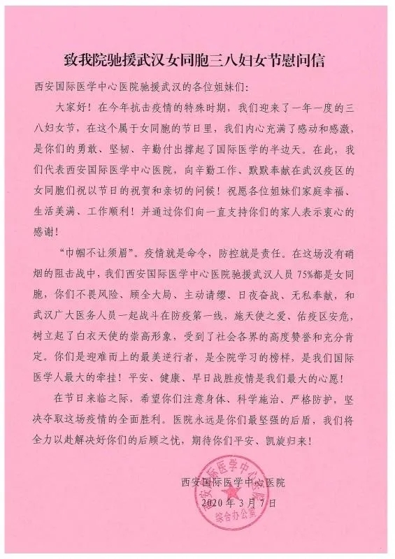 “疫”線有我,做“逆行先鋒”。疫情發(fā)生正值春節(jié)假期,西安國際醫(yī)學(xué)中心醫(yī)院從全面部署防控工作到建立聯(lián)防聯(lián)控工作機(jī)制,從醫(yī)療隊(duì)員火速馳援到醫(yī)療物資緊急保障,從正式進(jìn)駐武漢第八醫(yī)院和隨州市中心醫(yī)院到全面接收新冠患者……都有女隊(duì)員們不懼危險、日夜奮戰(zhàn),同時間賽跑,與病魔較量的身影。2月2日,接陜西省衛(wèi)健委馳援武漢的指令,5個小時,1000余名女醫(yī)護(hù)人員主動請纓,遞交了請戰(zhàn)書、紅手印。腫瘤醫(yī)院副院長薛妍教授、感控部主任劉冰、總護(hù)士長倪曉慧等醫(yī)護(hù)人員舍小家、為大家,迅速出擊、臨危不懼,不計(jì)名利、不顧生死,于2月3日搭乘包機(jī)到達(dá)指定地點(diǎn),令人肅然起敬,令人敬佩感動。