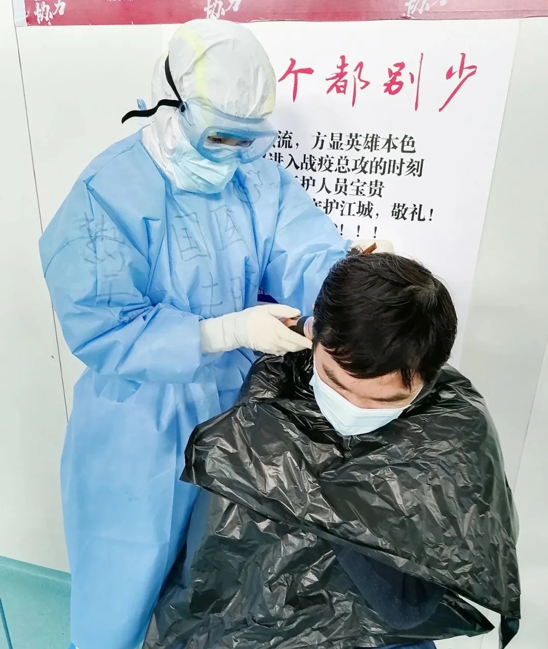 1艙有康復(fù)人員想理發(fā),手頭沒(méi)有工具,朱晴護(hù)士長(zhǎng)得知后,聯(lián)系下個(gè)班次護(hù)士帶來(lái)推子,給大家理發(fā)?!翱茨銊?dòng)作很嫻熟啊,以前練過(guò)的吧”,“圍觀群眾”打趣道?!艾F(xiàn)學(xué)現(xiàn)賣,大家要求不要太高,有壓力??!”朱晴說(shuō)。一直推到推子沒(méi)電,朱晴給6位康復(fù)人員簡(jiǎn)單修剪了頭發(fā)。得知朱晴是西安醫(yī)療隊(duì)的護(hù)士,大家都親切的稱她“肉夾饃”!