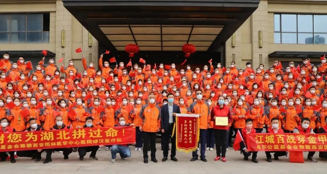 現(xiàn)場,武漢市為西安國際醫(yī)學(xué)中心醫(yī)院援漢醫(yī)療隊頒發(fā)錦旗,授予“最美逆行團隊”榮譽匾牌。卓爾公益基金會等將一張張“最美逆行者”榮譽證書禮送到隊員們手中,向英雄們表達(dá)崇高敬意。
