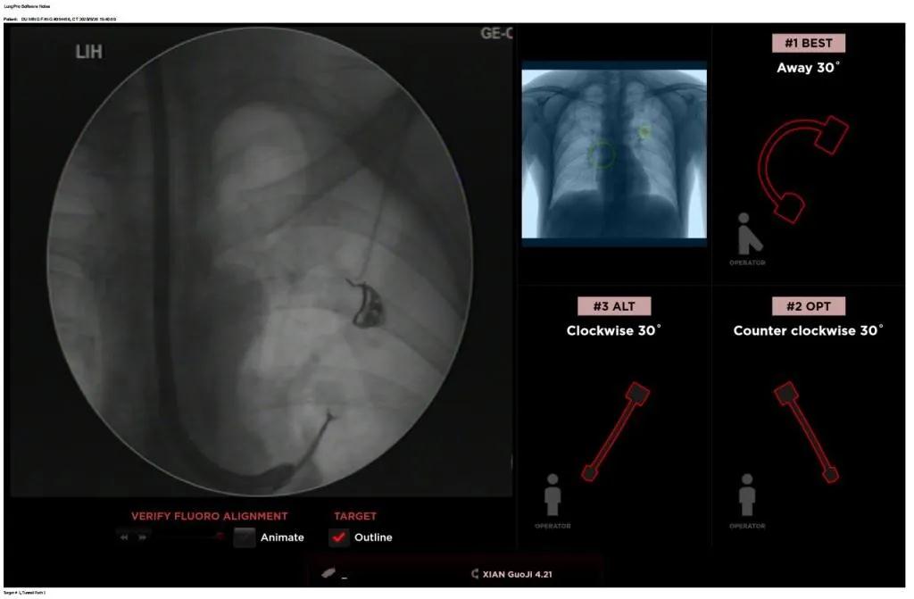 患者是一位59歲的男性,入院診斷左固有上葉前段肺小結(jié)節(jié),大小1.5cm*1.5cm。因?yàn)椴≡钆c支氣管不相通,無(wú)法開(kāi)展經(jīng)支氣管自然腔道的活檢,而且病變距離胸壁較遠(yuǎn)、肋骨阻隔進(jìn)針線(xiàn)路、病灶周?chē)醒馨@,如果進(jìn)行CT引導(dǎo)下經(jīng)皮肺穿刺活檢,則存在較大的氣胸、出血等并發(fā)癥的風(fēng)險(xiǎn)。