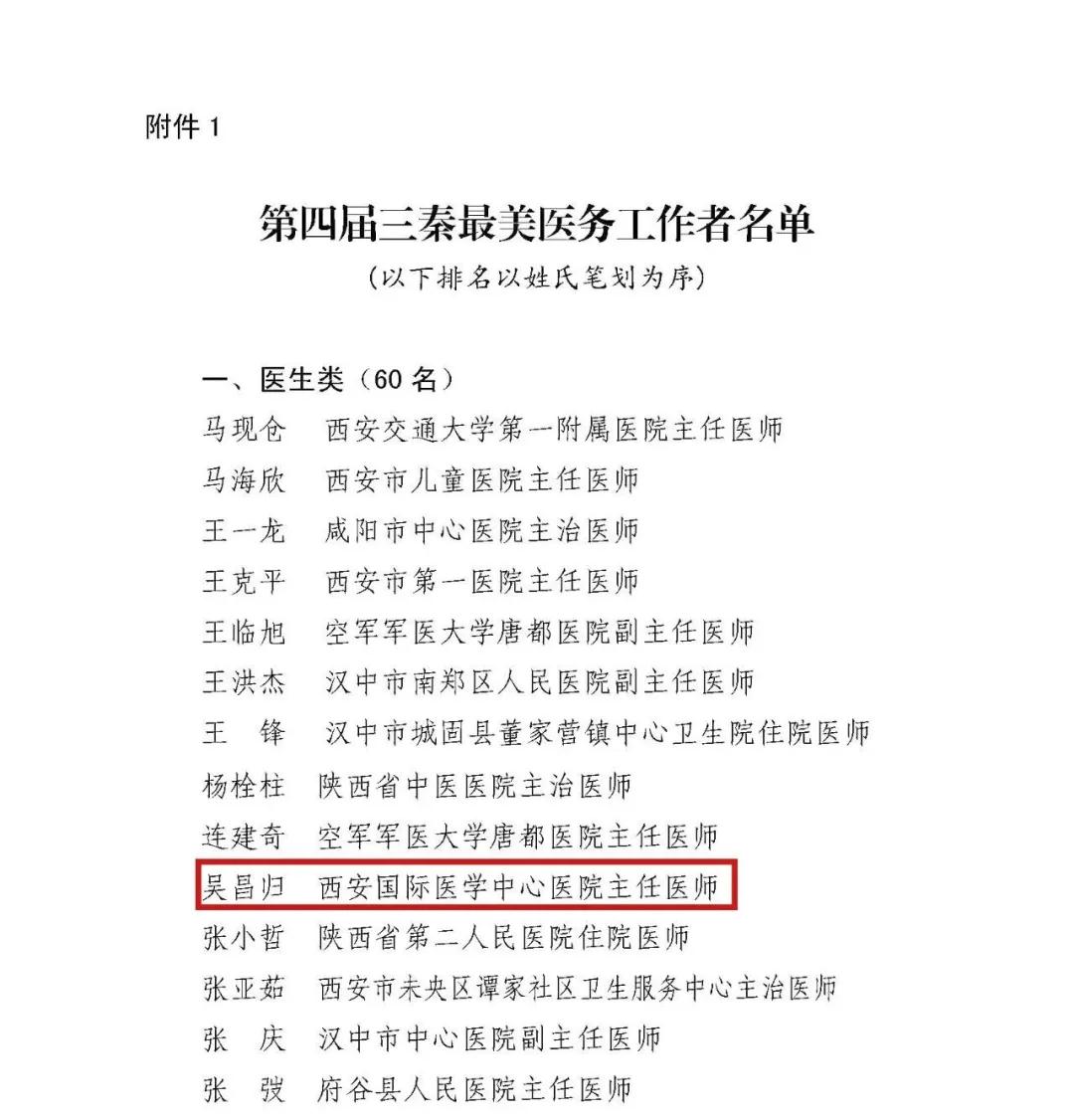 日前,陜西省衛(wèi)健委授予西安國(guó)際醫(yī)學(xué)中心醫(yī)院胸科醫(yī)院吳昌歸院長(zhǎng)“第四屆三秦最美醫(yī)務(wù)工作者”榮譽(yù)稱(chēng)號(hào)。