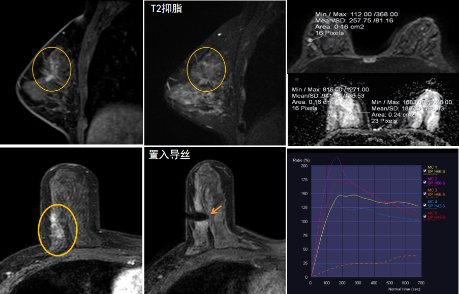 今年45歲的某女士,兩個月前行超聲檢查發(fā)現右乳結節(jié),乳腺X線攝影檢查提示右乳外上象限局部腺體結構扭曲并簇狀無定形鈣化,為了進一步評估病變性質并確定范圍進行了乳腺MR平掃 DWI 增強的檢查,經MR評估發(fā)現右乳病變范圍較廣,評估為BI-RADS 4類可疑病變,需要取得病理學結果。