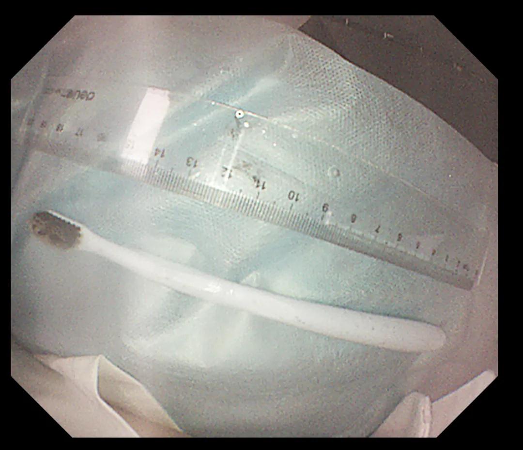 經(jīng)過反復(fù)努力嘗試,圈套器終于緊緊的套住異物,使牙刷長軸盡量與食道長軸平行,適當(dāng)注氣擴(kuò)張食道腔。經(jīng)過不懈努力,順利將其取出,取出牙刷經(jīng)測量長度約20cm,似乎這條細(xì)細(xì)的胃鏡就是一條連接希望的生命線。此時在場所有人懸著的那顆心也終于落下。術(shù)后小楊癥狀逐漸消失,生命指征平穩(wěn),情緒也平靜下來。