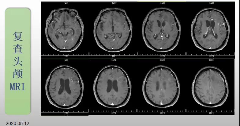 70歲的郝女士去年曾在外院查出“左額島葉”膠質(zhì)母細胞瘤(WHO Ⅳ級),并做了左側(cè)額島葉占位性病變切除術(shù)。術(shù)后進行了同步放化療。由于治療條件有限,郝女士慕名來到我院就診。賀世明主任率領(lǐng)醫(yī)護團隊立即為郝女士進行了全面的檢查,決定為其進行綜合治療 電場治療。經(jīng)過三個多月的綜合治療,患者復查頭顱MRI病變較前明顯縮小。出院時,郝女士神志清醒,睡眠飲食正常,說話很流利?!拔沂翘芍M來的,現(xiàn)在不用人攙扶,自己就可以走出病房了?!焙屡坷t(yī)護人員的手說。
