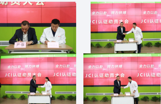 尹強(qiáng)院長與??漆t(yī)院院長、臨床科室、醫(yī)技科室、檢驗(yàn)中心及機(jī)關(guān)職能部門主任、代表,簽署了《評審目標(biāo)責(zé)任書》。消化病醫(yī)院執(zhí)行院長韓國宏、腫瘤一病區(qū)黎冬梅護(hù)士長分別發(fā)言,一致表示,一定積極參與、配合、支持相關(guān)工作,為我院順利通過JCI認(rèn)證工作全力以赴!