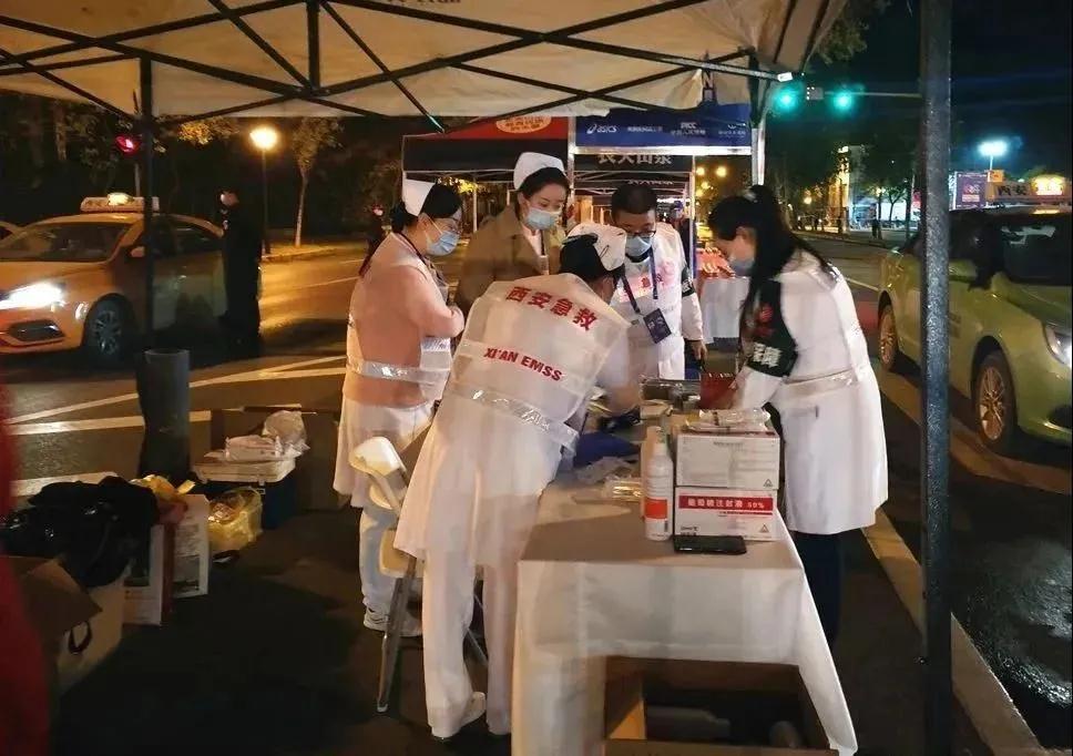 凌晨4點,醫(yī)療保障組分成3隊,分乘4輛車從醫(yī)院統(tǒng)一出發(fā)前往賽事現(xiàn)場。到達指定地點后,團隊立刻按照前期演練分工進行相關(guān)準備工作。7點30分,2020西安國際馬拉松正式鳴槍開跑,現(xiàn)場保障人員及時響應(yīng),積極救助受傷參賽選手,專業(yè)的技術(shù)和溫馨的言語,讓受傷的的選手們感到溫暖。