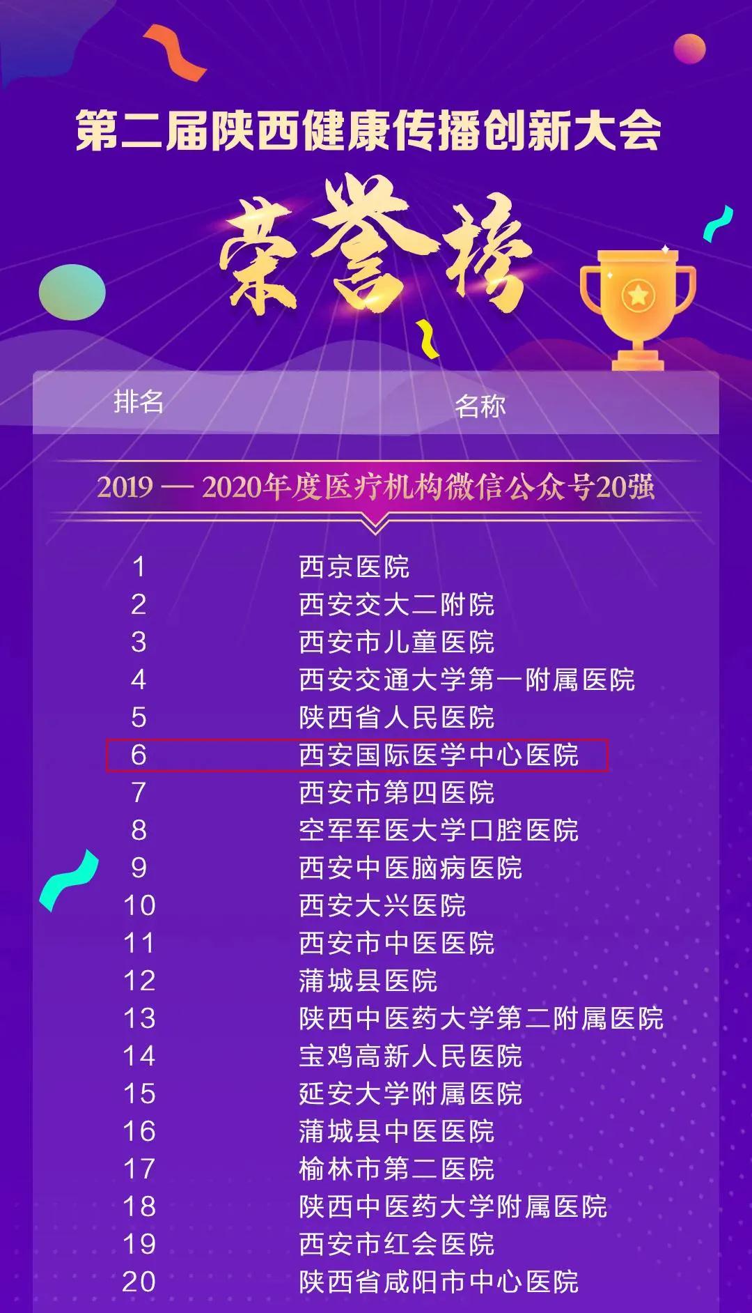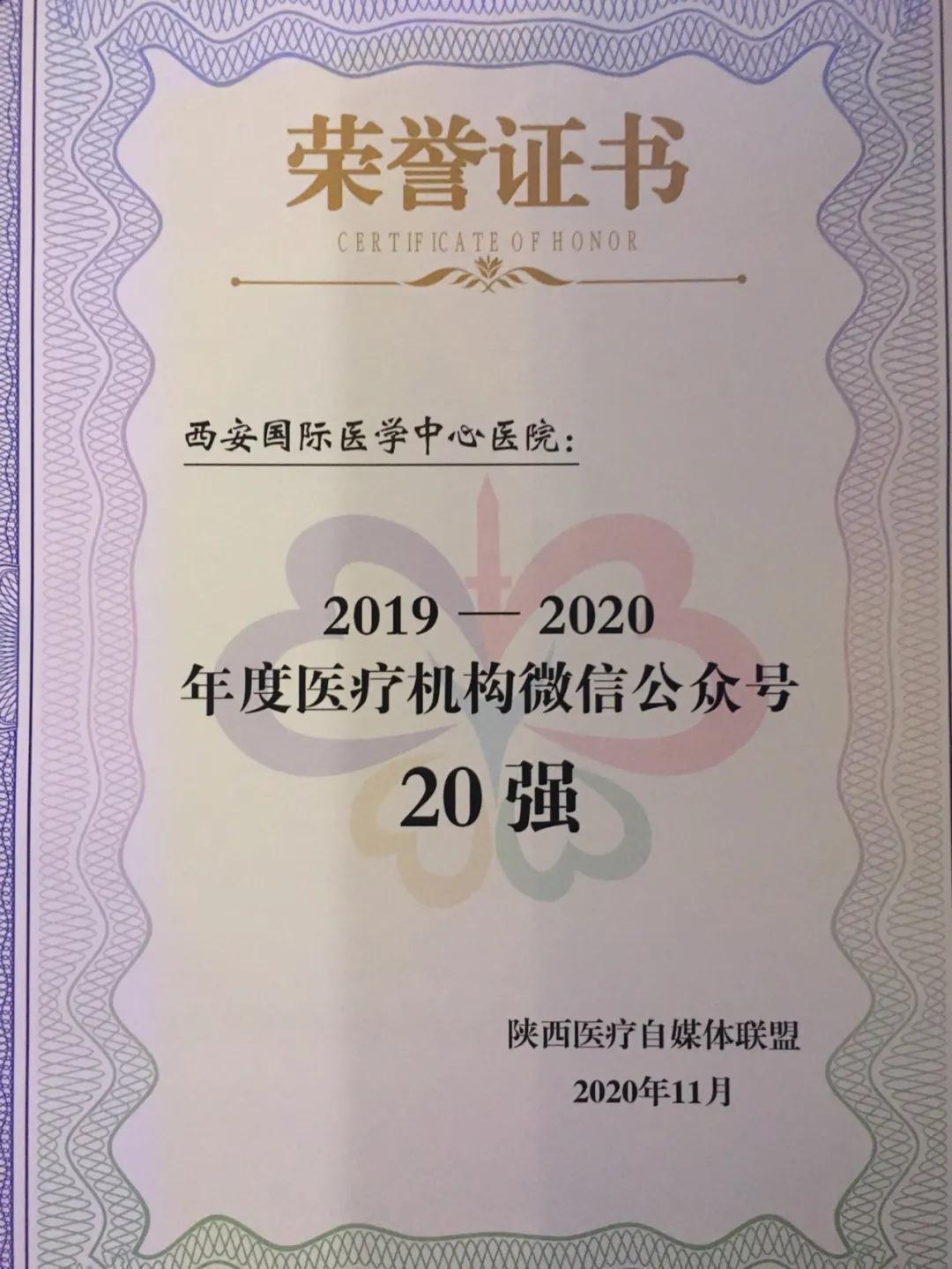 11月25日,由陜西省衛(wèi)生健康委員會(huì)、陜西省醫(yī)師協(xié)會(huì)指導(dǎo),陜西醫(yī)療自媒體聯(lián)盟、陜西省衛(wèi)生健康干部培訓(xùn)中心承辦的第二屆陜西健康傳播創(chuàng)新大會(huì)在西安召開。西安國(guó)際醫(yī)學(xué)中心醫(yī)院微信公眾號(hào)榮獲2020年陜盟醫(yī)療機(jī)構(gòu)微信公眾號(hào)第六名。