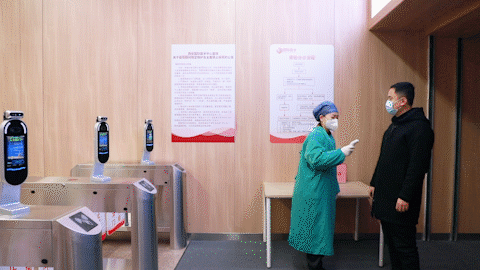 在地鐵閘機口,西安國際醫(yī)學中心醫(yī)院設(shè)立預檢通道,醫(yī)務人員為所有進入院區(qū)人員測量體溫,并查驗“一碼通”。健康碼為綠碼、體溫<37.3℃且無流行學史的方可進入,若體溫≥ 37.3℃、有呼吸道癥狀或流行病學史、健康碼為黃色或紅色的人員由預檢醫(yī)務人員登記完成后帶至發(fā)熱門診。