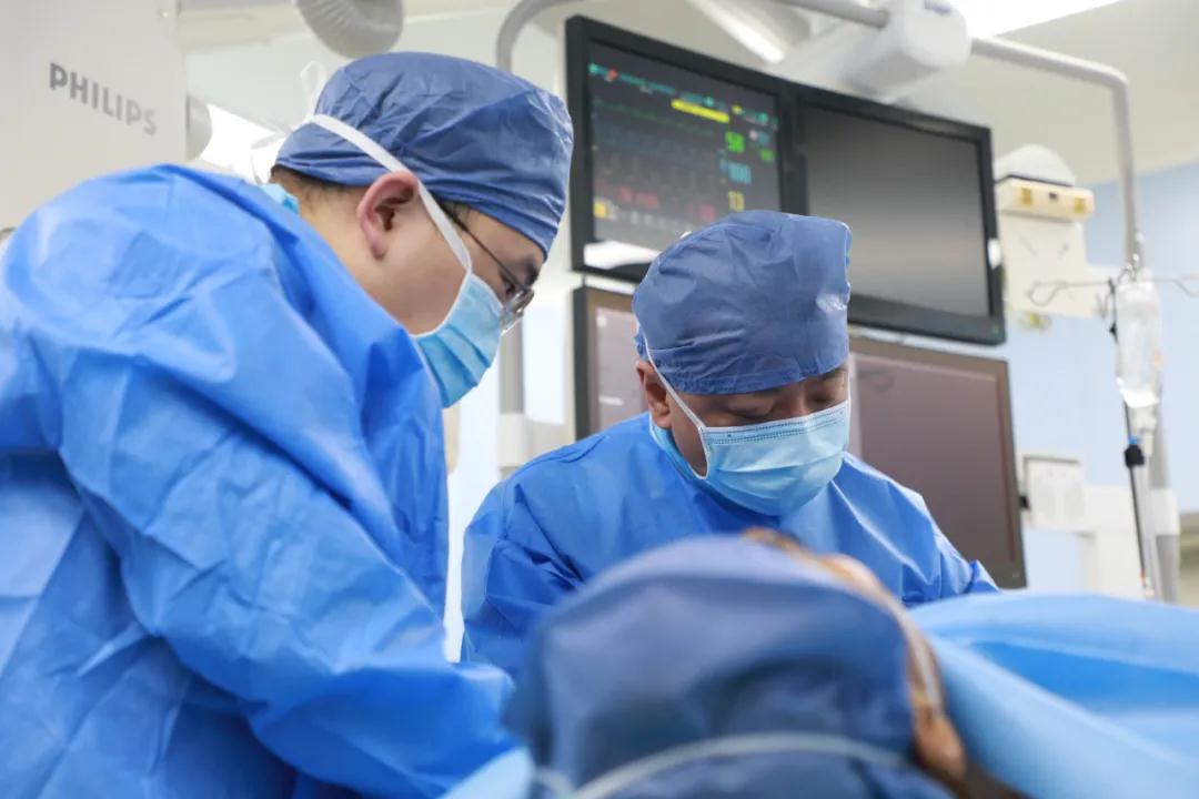 按照術(shù)前制定的方案,郭穎強主任和楊金保博士首先嘗試開通閉塞的右腎動脈,但由于血栓機化、鈣化嚴重,右腎動脈難以開通。遂謹慎擴張狹窄的左腎動脈,并成功植入一枚支架。之后經(jīng)過反復(fù)旋磨、抽吸,順利開通髂動脈,但腹主動脈閉塞段仍難以擴通。此時,患者居高不下的血壓很快恢復(fù)到正常水平。
