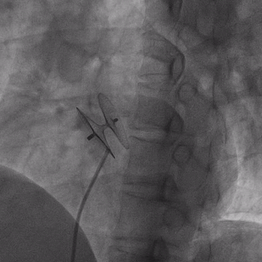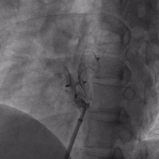在獲得患者同意后,1月12日,尚福軍主任為患者進(jìn)行了PFO封堵術(shù)。術(shù)中造影可見封堵器殘余漏,尚福軍主任用精湛的技藝,順利通過(guò)封堵器殘余漏裂縫,將右心導(dǎo)管從右房送入左房,且順利到達(dá)肺靜脈;遂行卵圓孔未閉封堵術(shù)后殘余漏再次封堵;且完美釋放PFO封堵器,可見兩封堵器呈“馬蹄蓮”狀,再次術(shù)中造影未見殘余漏。