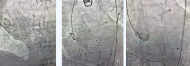 術(shù)中,曾廣偉主任團(tuán)隊(duì)高效配合,完成了特定時(shí)間點(diǎn)起搏心臟、臨時(shí)短時(shí)間關(guān)閉呼吸機(jī)、降低主動(dòng)脈瓣阻力、快速釋放瓣膜等一系列高難度操作,有效保證瓣膜精準(zhǔn)釋放。瓣膜釋放經(jīng)TEE確認(rèn),主動(dòng)脈瓣膜釋放位置佳,經(jīng)豬尾導(dǎo)管造影,主動(dòng)脈瓣返流即刻消失,且無瓣周瘺。