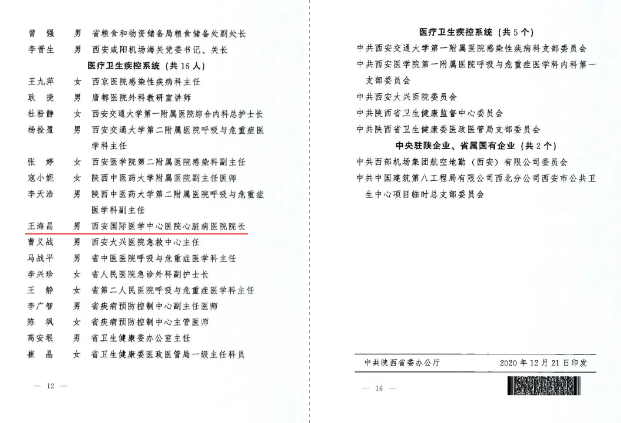 近期,中共陜西省委印發(fā)《關(guān)于表彰全省優(yōu)秀共產(chǎn)黨員和全省先進(jìn)基層黨組織的決定》,對在抗擊新冠肺炎疫情中涌現(xiàn)出來的134名優(yōu)秀共產(chǎn)黨員和45個(gè)先進(jìn)基層黨組織進(jìn)行了表彰。西安國際醫(yī)學(xué)中心醫(yī)院心臟病醫(yī)院院長王海昌被評為“陜西省優(yōu)秀共產(chǎn)黨員”。
