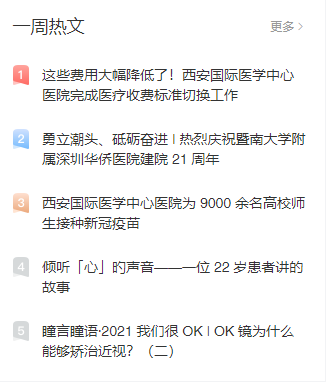 西安國(guó)際醫(yī)學(xué)中心醫(yī)院微信公眾號(hào)發(fā)布的《這些費(fèi)用大幅降低了!西安國(guó)際醫(yī)學(xué)中心醫(yī)院完成醫(yī)療收費(fèi)標(biāo)準(zhǔn)切換工作》《西安國(guó)際醫(yī)學(xué)中心醫(yī)院為9000余名高校師生接種新冠疫苗》《傾聽心的聲音——一位22歲患者講的故事》3篇文章入選丁香園丁香號(hào)的一周熱文榜單前五名。