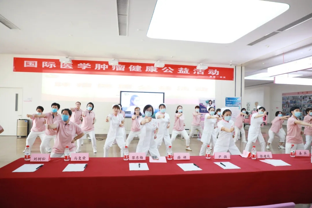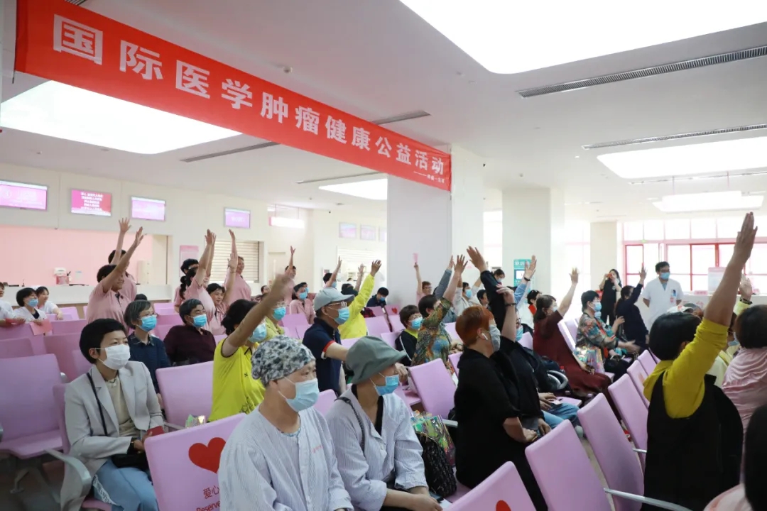 腫瘤一病區(qū)的醫(yī)護(hù)人員和志愿者們共同演練了一段八段錦,隨后的健康知識(shí)問答和歌曲快閃環(huán)節(jié)將活動(dòng)氛圍推向高潮,大家爭先恐后地舉手搶答,現(xiàn)場(chǎng)問答也促進(jìn)了對(duì)于腫瘤防治、康復(fù)知識(shí)的推廣。最后,大家合唱歌曲“相信我們會(huì)創(chuàng)造奇跡”,積極、歡樂的氛圍縈繞不息?;顒?dòng)最后,薛妍副院長、劉樹松教授和張俊美醫(yī)生對(duì)患者的提問進(jìn)行了耐心、細(xì)致的解答。