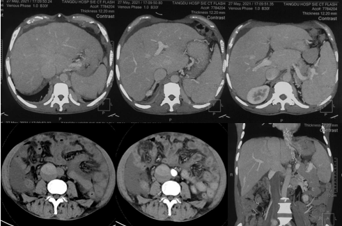6月20日,患者及家屬懷揣著忐忑的心情來到西安國際醫(yī)學(xué)中心醫(yī)院找到韓國宏教授,韓教授詢問病情后閱患者外院CT片,明確診斷布加綜合征,同時發(fā)現(xiàn)了一個新的問題,在詢問病史時了解到患者近一周雙下肢乏力伴腫脹明顯加重,遂立即安排了急診CT,證實下腔靜脈內(nèi)急性血栓形成!