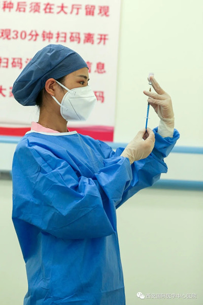 掃碼,拆開包裝,取出疫苗,拿出一次性針頭,扎進瓶中,抽出液體,注射到接種對象胳膊上……今天的這位接種者,是西安國際醫(yī)學中心醫(yī)院護士楊婕接種的第13230人。