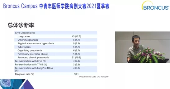 據(jù)歐陽海峰介紹,本次參評病例是一項單中心隊列研究的病例數(shù)據(jù)。部分肺部結(jié)節(jié)、肺部包塊患者存在診斷困難的問題。患者前期在多家醫(yī)院行氣管鏡檢查,均無法明確診斷。通過歐陽海峰團隊LungPro導航 超細MP290F支氣管鏡 1.1mm冷凍探針 rEBUS的TBCB術(shù)式,診斷率高達90%以上。對于仍無法明確診斷的少部分病例,通過BTPNA、LungPro-TBNA、TTNB等術(shù)式也獲得了明確診斷。經(jīng)文獻檢索,此項研究是該術(shù)式的首次報道。目前,困難取材的肺部及縱隔疾病是歐陽海峰團隊主要病種之一,也是引領(lǐng)性特色技術(shù)之一。