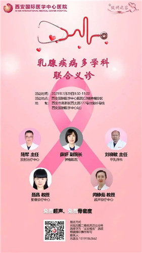 為方便患者就醫(yī),提高群眾乳腺健康意識,由西安國際醫(yī)學中心醫(yī)院腫瘤醫(yī)院、甲乳外科、放射治療中心、影像診療中心、超聲診療中心多位知名專家組成團隊,為廣大乳腺疾病患者提供全面、專業(yè)及個體化診療,并提供免費乳腺超聲和骨密度檢查,歡迎掃碼報名。
