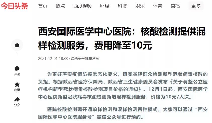 西安國際醫(yī)學(xué)中心醫(yī)院:核酸檢測提供混樣檢測服務(wù),費(fèi)用降至10元