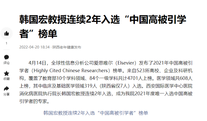 陜西老年健康報:韓國宏教授連續(xù)2年入選“中國高被引學(xué)者”榜單