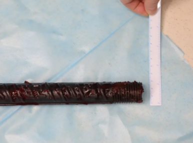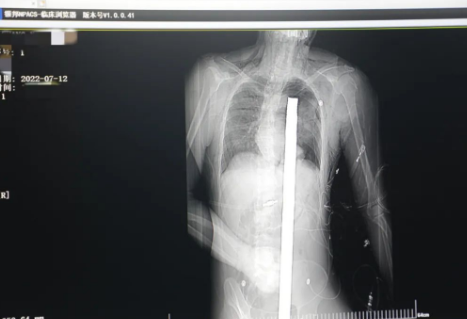情況緊急!術(shù)中探查后發(fā)現(xiàn),長(zhǎng)120cm直徑3cm的螺紋鋼經(jīng)患者右側(cè)會(huì)陰部穿入,傷及直腸,途徑膀胱后方,左側(cè)髂總動(dòng)靜脈之間傷及左腎后,經(jīng)胰腺后方在肝脾之間穿破膈肌,在下肺靜脈前方穿入左肺穿破氣管及左右主支氣管膜部,止于主動(dòng)脈弓下水平,穿入體內(nèi)的部分達(dá)到75cm。