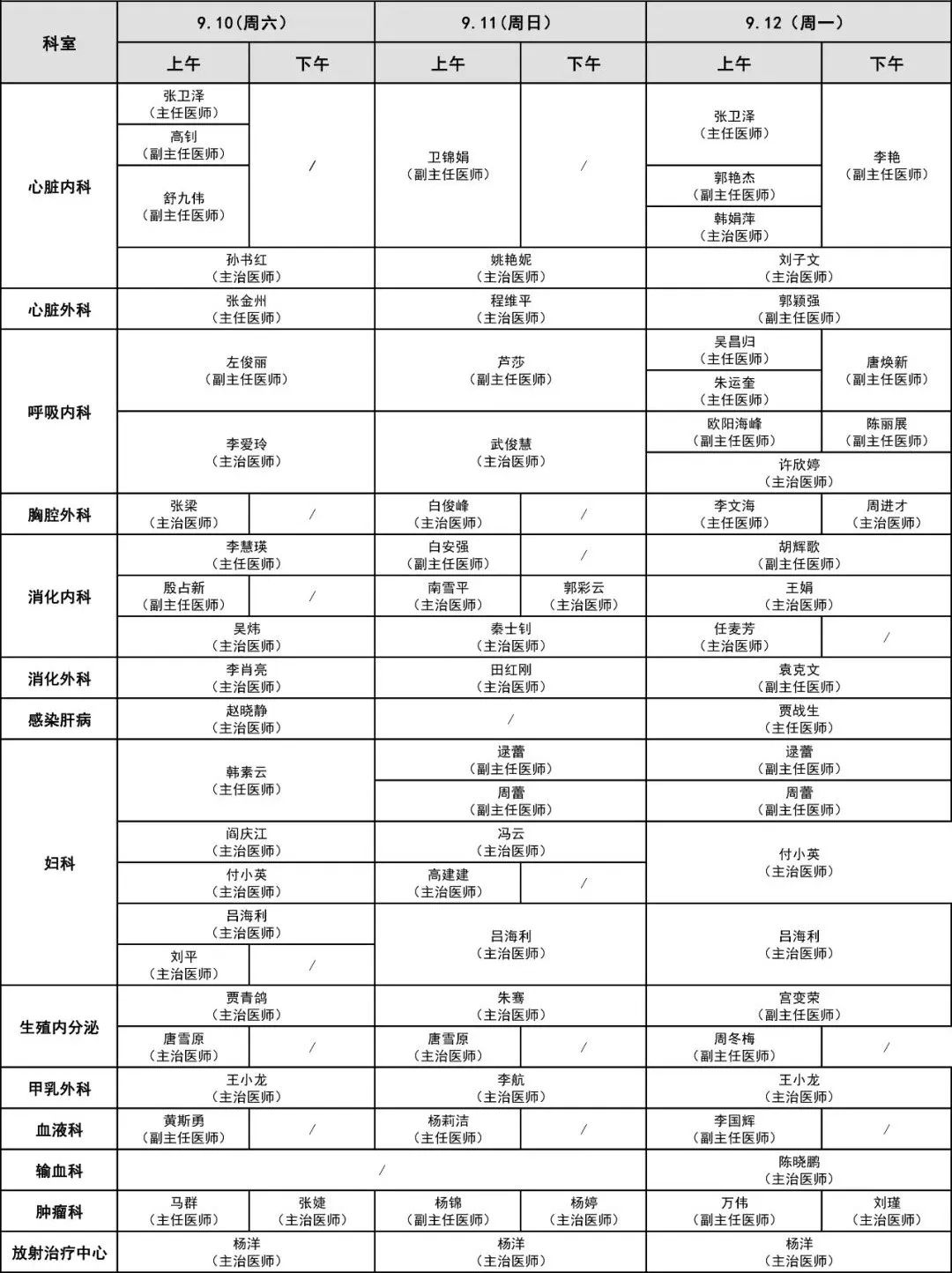 中秋節(jié)門診醫(yī)師出診信息