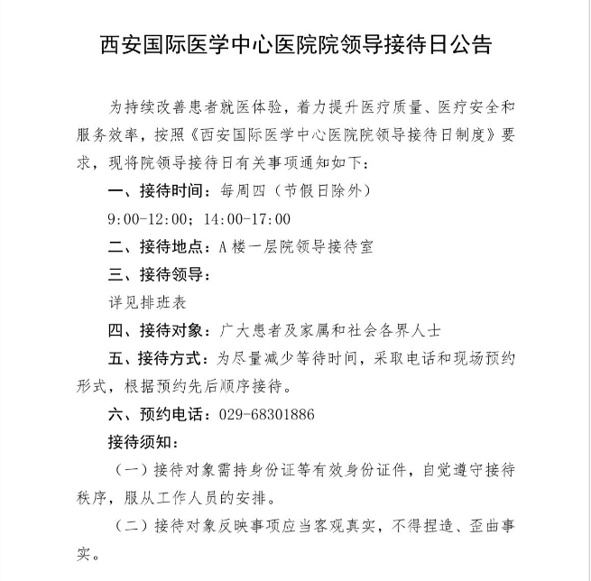 西安國際醫(yī)學中心醫(yī)院院領(lǐng)導接待日公告
